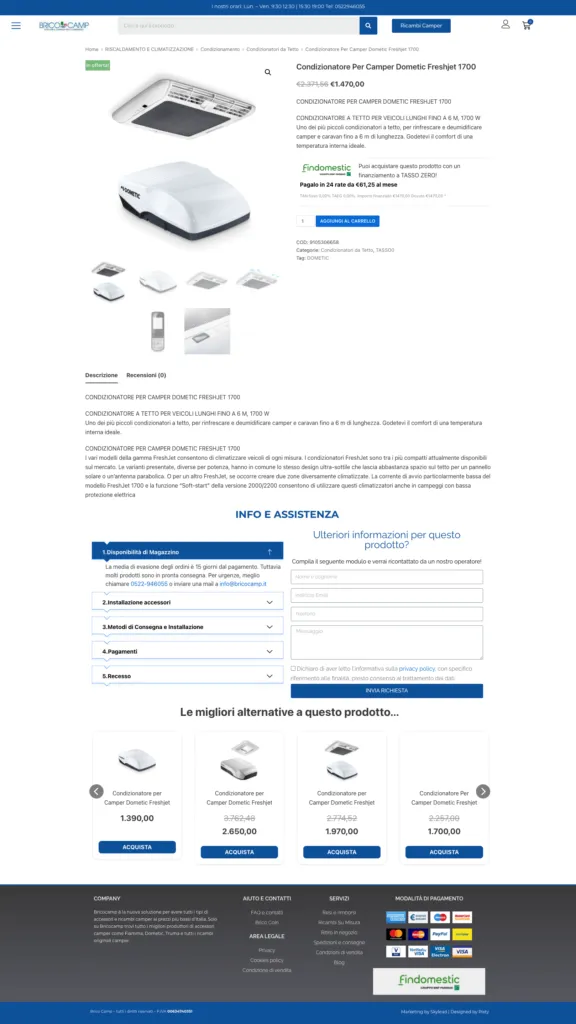 3C S.r.l. mette a disposizione dei propri clienti un sito e-commerce interamente dedicato alla vendita online di accessori e ricambi per il mondo del camper. Il progetto Bricocamp.com nasce nel 2014 divenendo ben presto un punto di riferiferimento per appassionati e professionisti e conta oggi un listino di oltre 10 mila articoli in vendita a prezzi estremamente competitivi. Inoltre la possibilità di richiedere ricambi specifici per qualsiasi modello di camper.