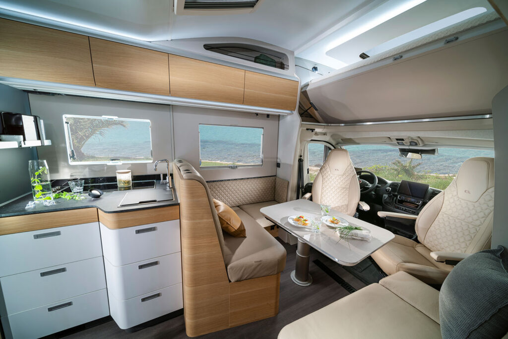Il salone offre spazio e un’ampia dinette con comode sedute, fino a sette posti omologati e opzione Isofix.