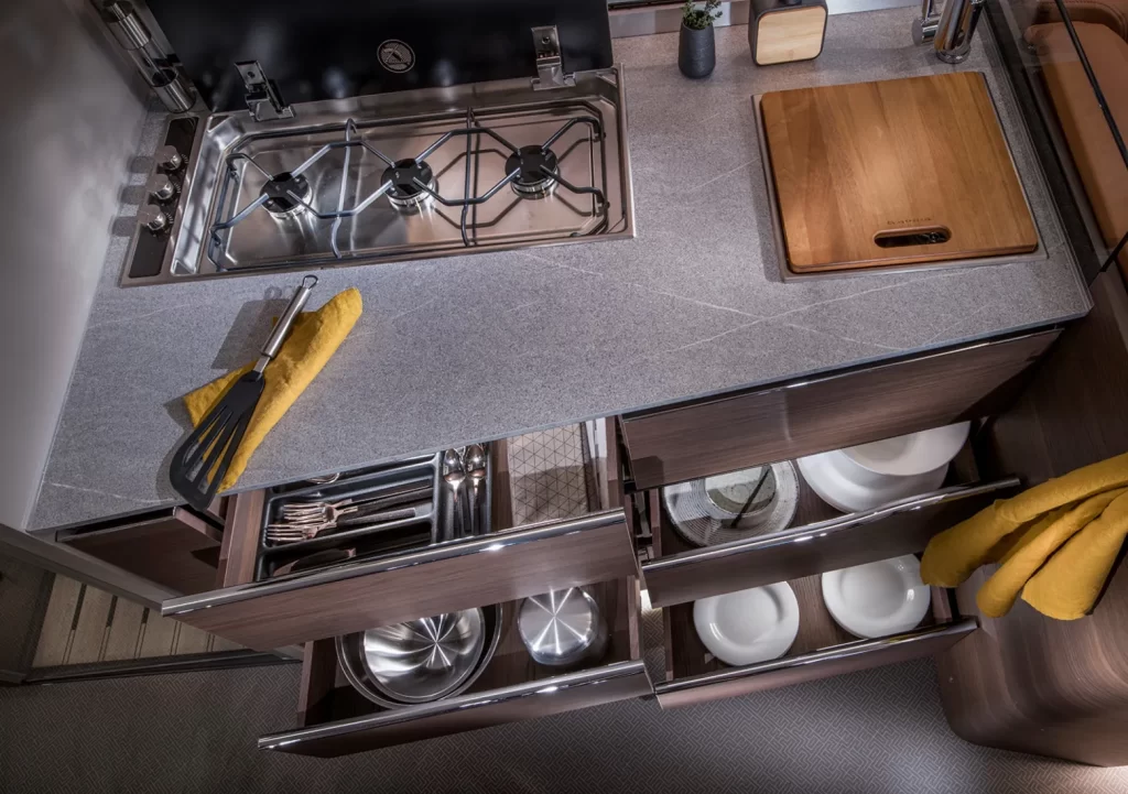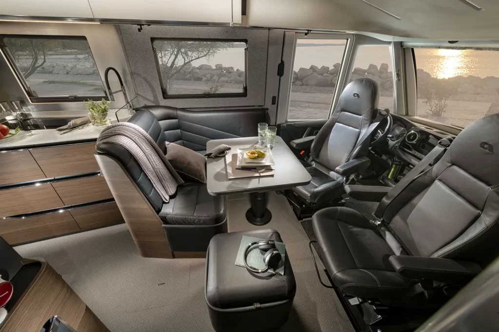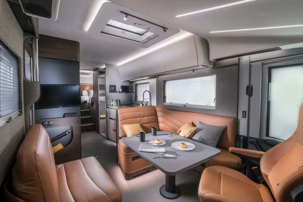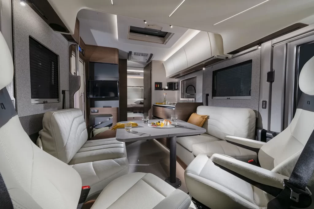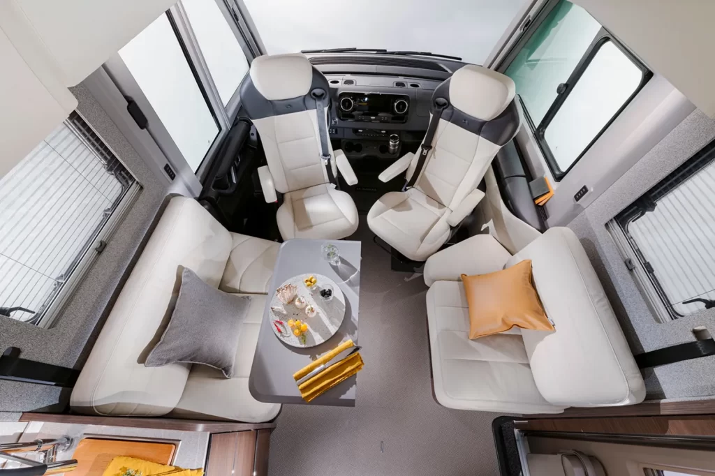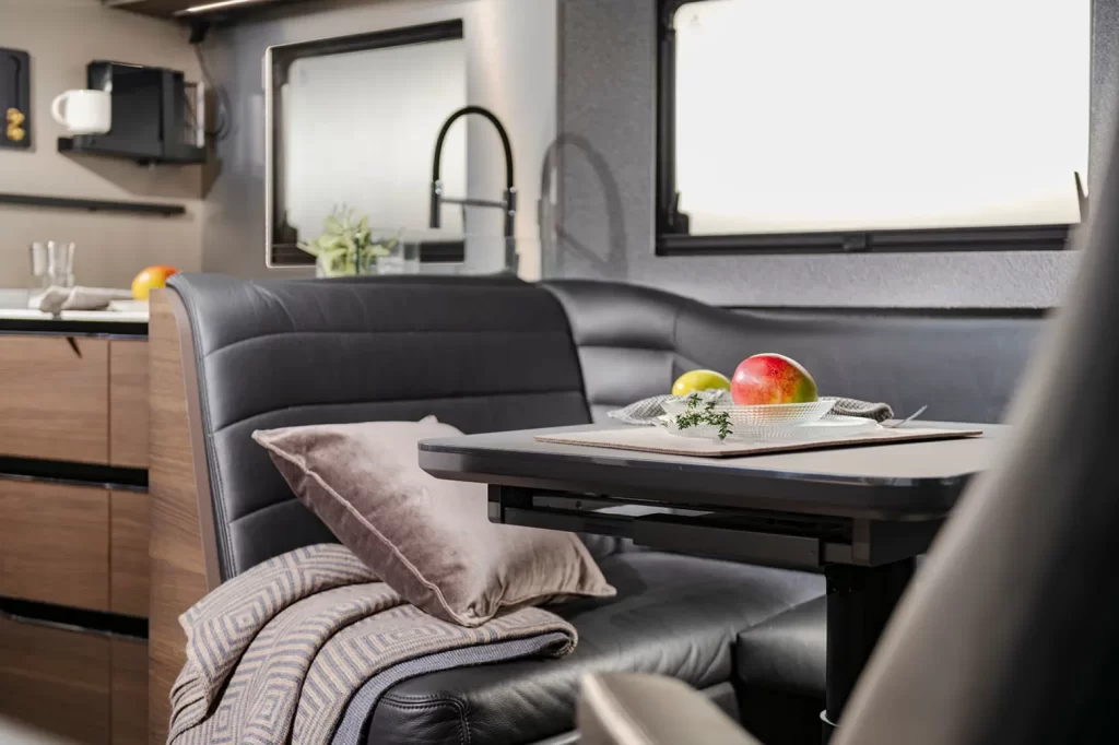 Zona dinette dal design moderno in stile open space, con parete divisoria ribassata e dinette a L o face-to-face (a seconda dei modelli), dotate di cuscini confortevoli e rivestiti con materiali di qualità.