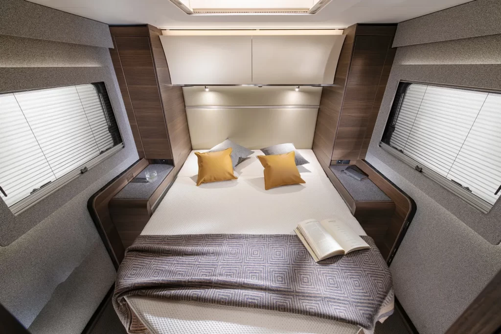 Elegante camera da letto posteriore dotata di letto centrale king-size regolabile elettricamente (1.500 x 1.950 mm) o letti gemelli (2.050 x 830 mm), tutti dotati di rete a doghe e materassi Luxe.