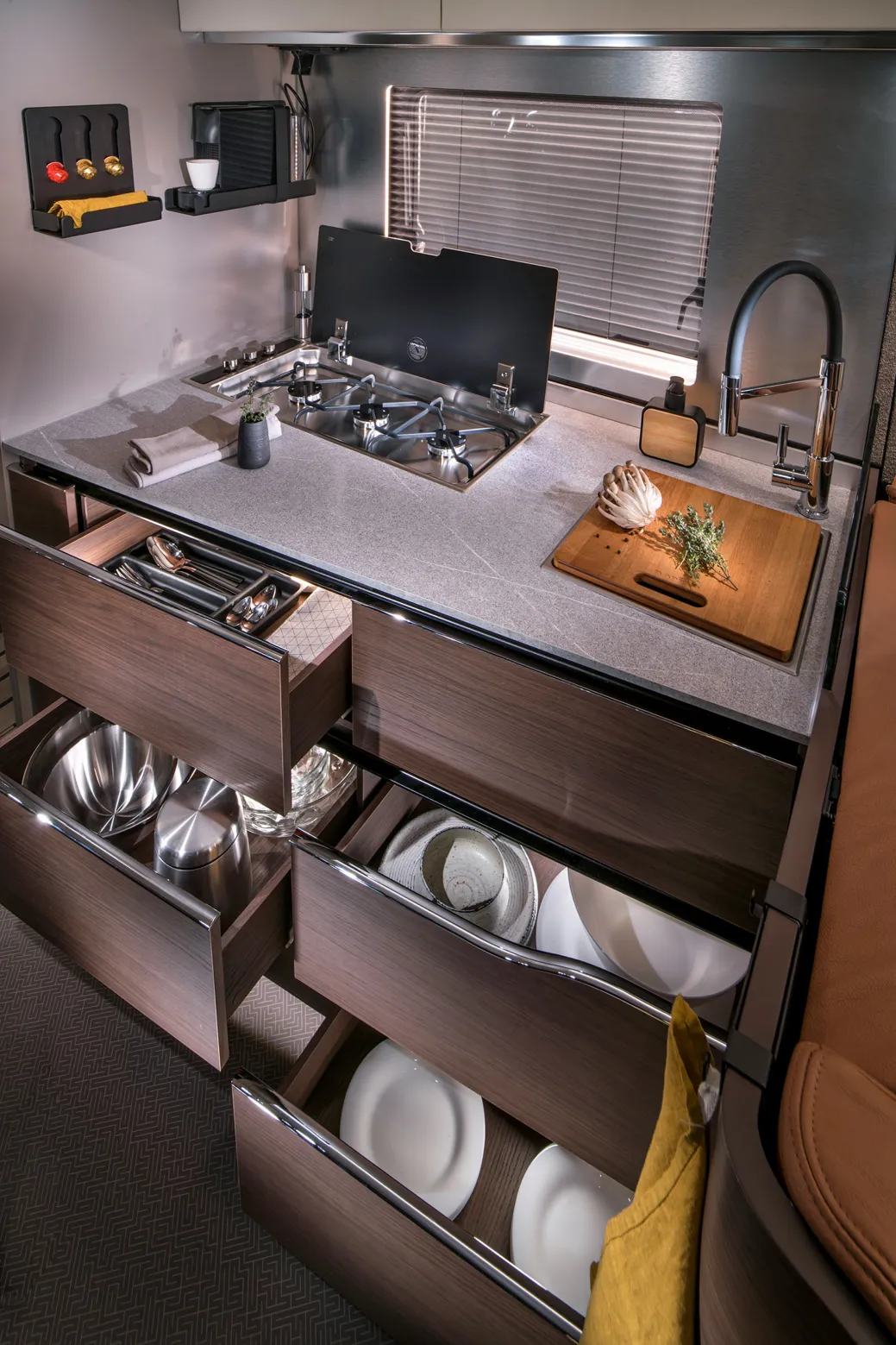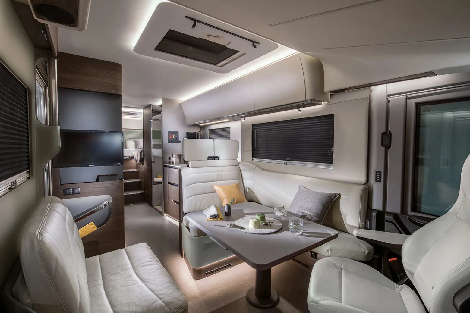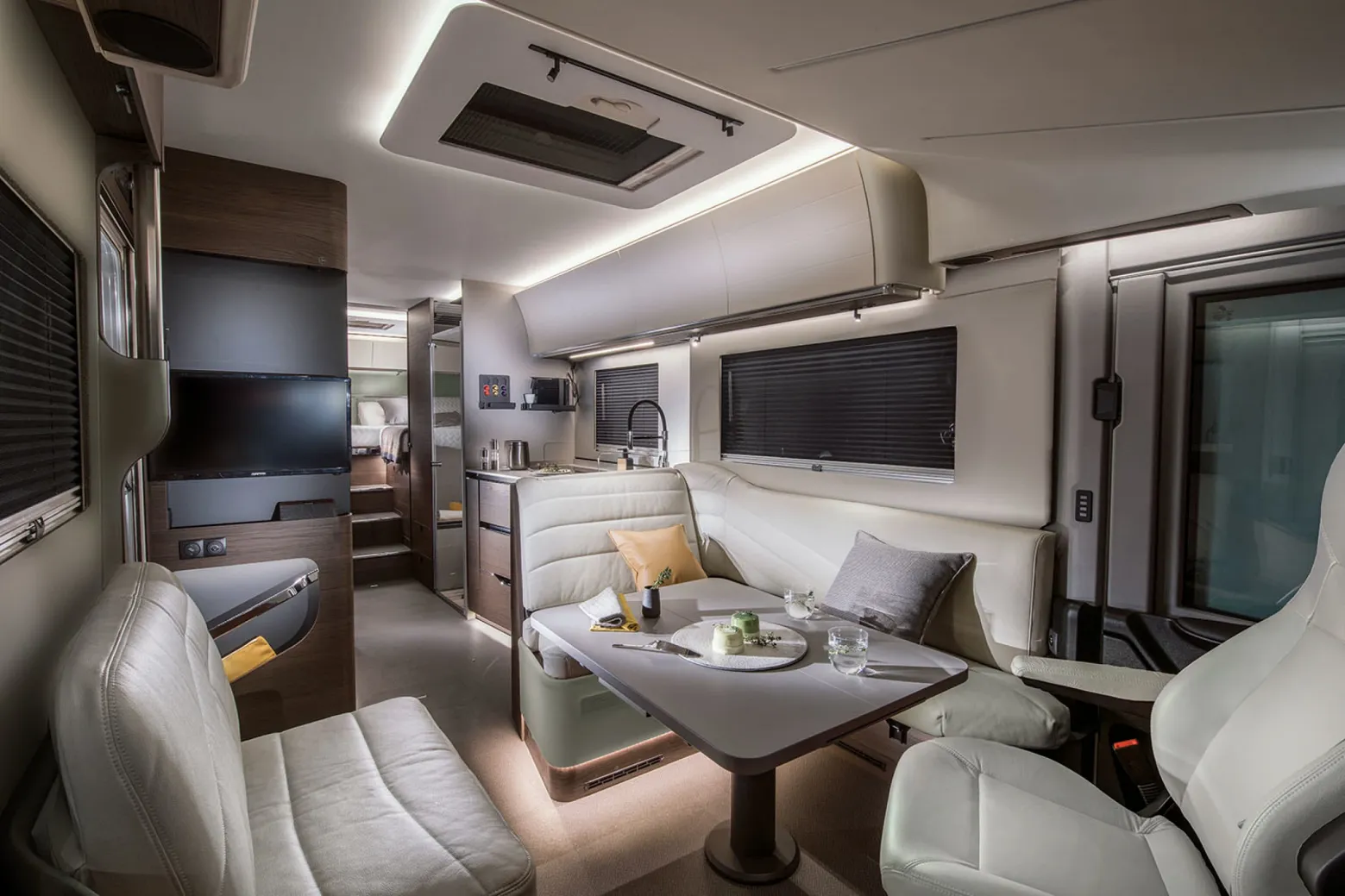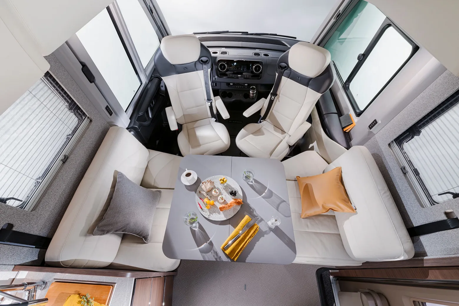 Zona dinette dal design moderno in stile open space, con parete divisoria ribassata e dinette a L o face-to-face (a seconda dei modelli), dotate di cuscini confortevoli e rivestiti con materiali di qualità.