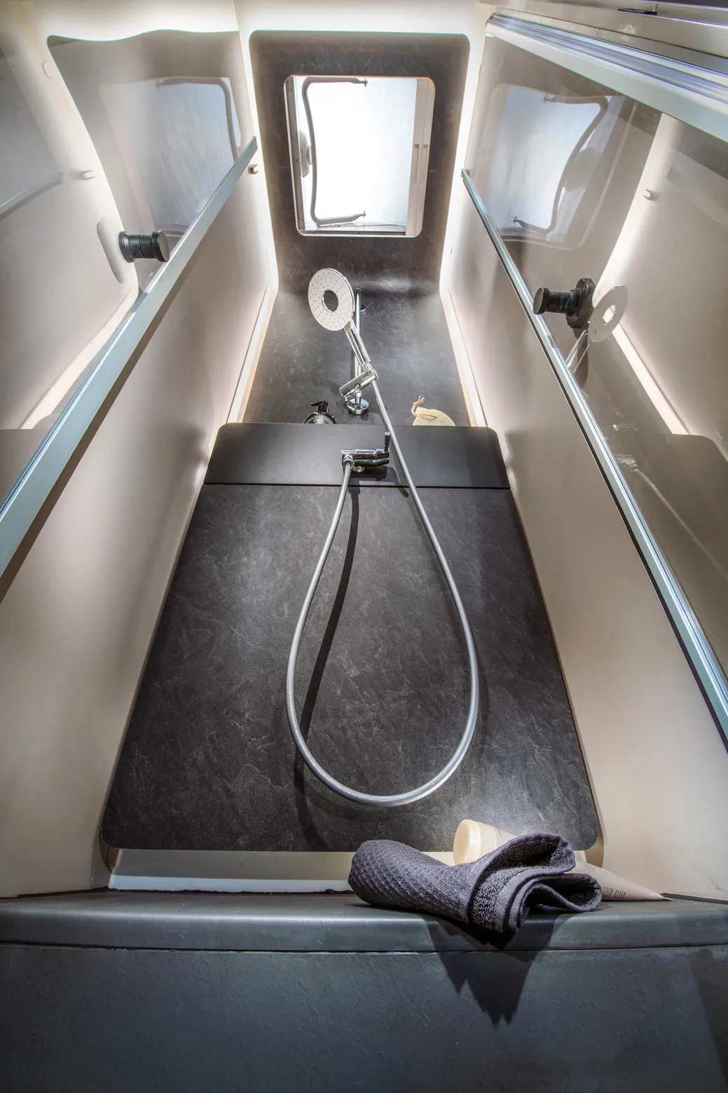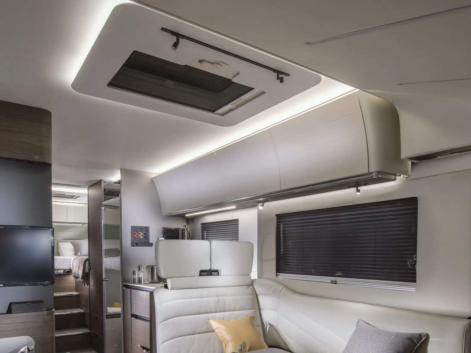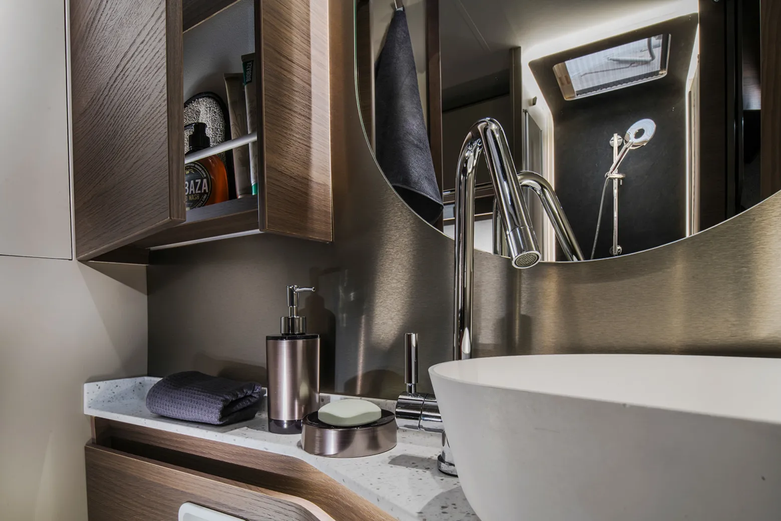 Elegante camera da letto posteriore dotata di letto centrale king-size regolabile elettricamente (1.500 x 1.950 mm) o letti gemelli (2.050 x 830 mm), tutti dotati di rete a doghe e materassi Luxe.