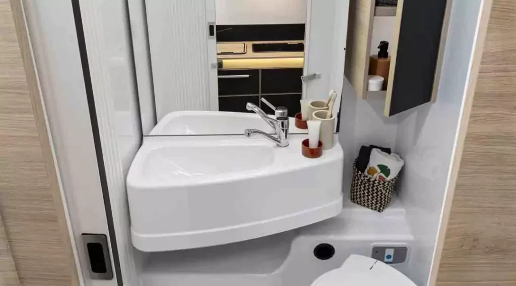 Accessori integrati: portasapone, portabicchiere, portasciugamani.