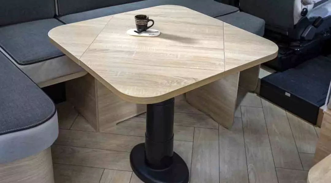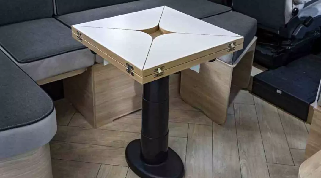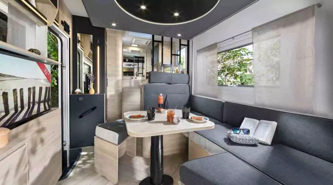 Questo profilato è fuori dal comune, in quanto, oltre all’accesso principale, dispone di un accesso di servizio per il garage e i vani portaoggetti. Il 240 è il primo a proporre all’interno una vetrata per separare la cucina dal salone a U modulabile (8 posti “aperitivo” di serie), il tutto in meno di 7m!