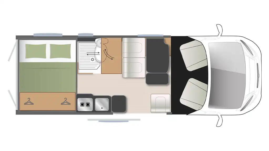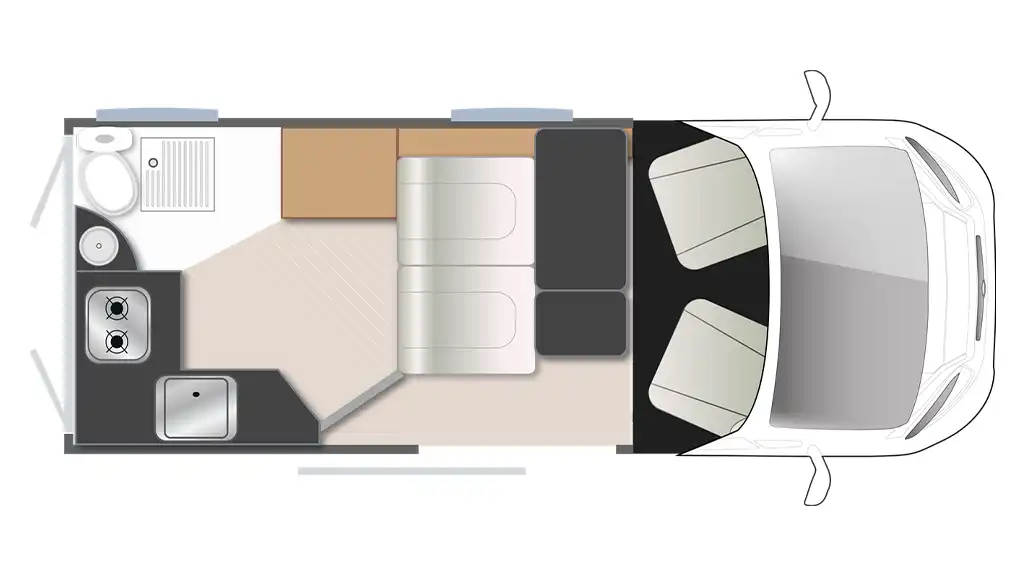 Horizon H100, una disposizione interna fuori dal comune, un van compatto con grande abitabilità interna e dotazioni per il massimo confort e libertà di viaggio con la batteria a lithio, retrocamera, luce esterna, zanzariera porta ingresso, doccetta enterna e molto altro.