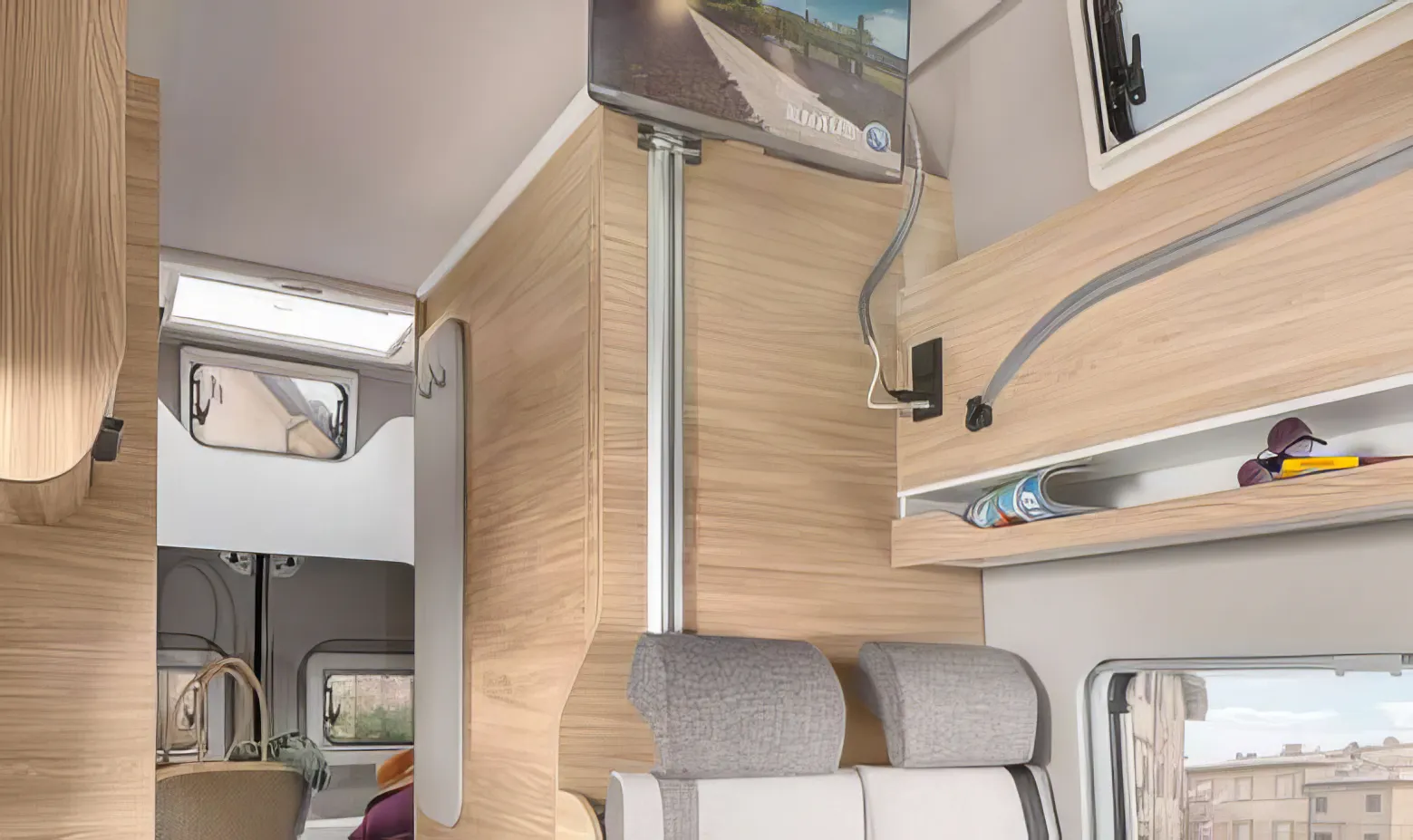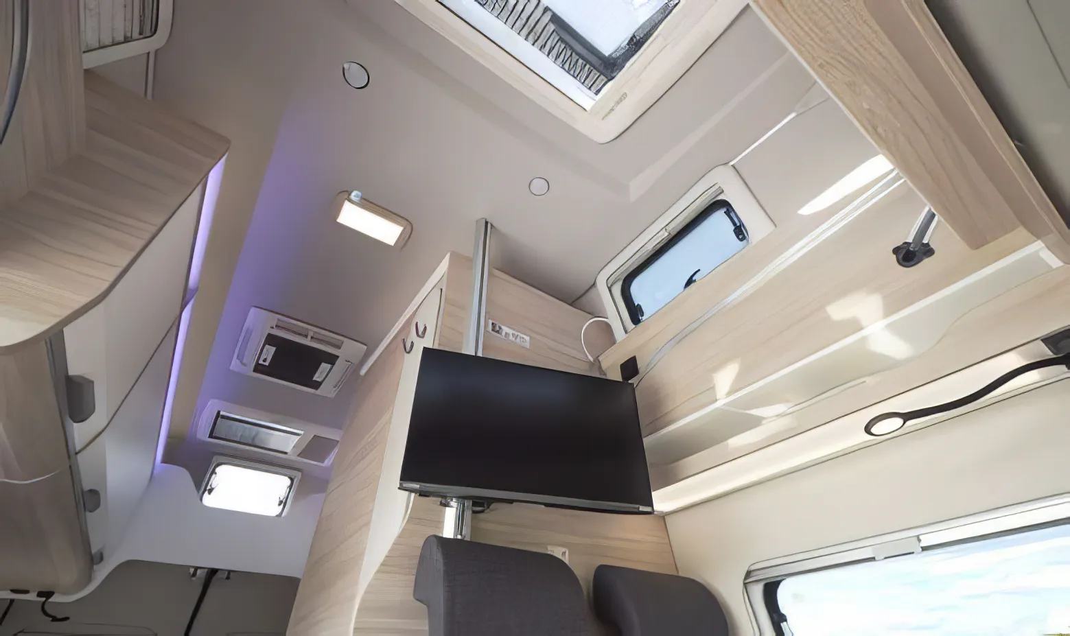 Tavolo da pranzo sospeso con prolunga Bagno a volume variabile multifunzionale Letto basculante di serie nel tetto rialzato Luminoso finestra panoramica (anteriore) 2 zone notte separate TV regolabile in altezza e luci RGB