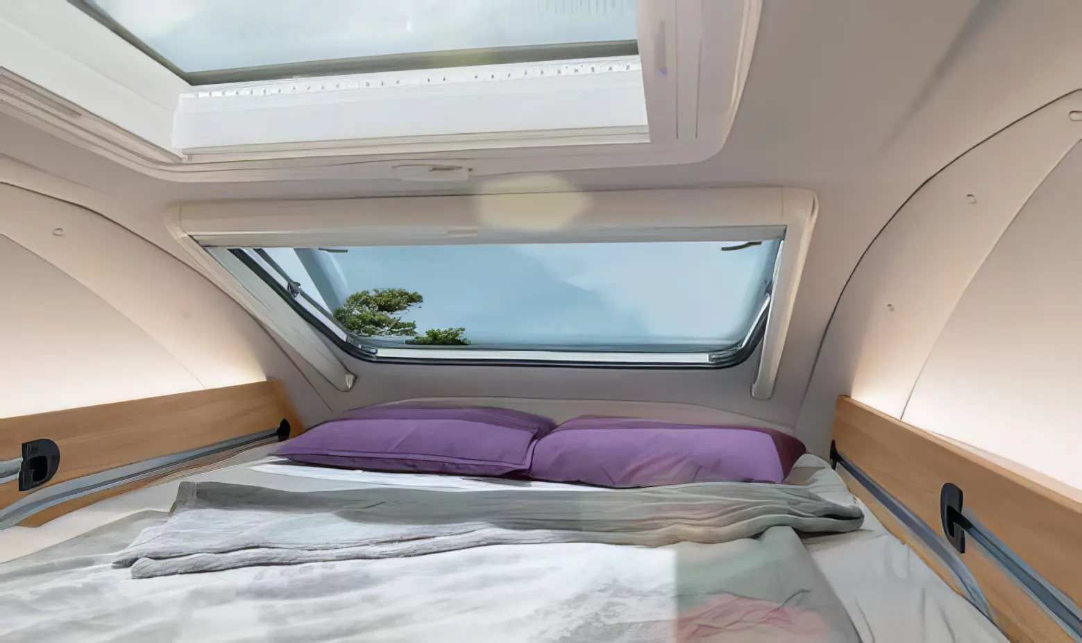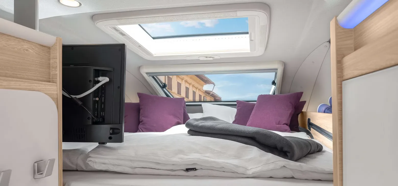 Grazie al letto nel tetto rialzato, facilmente estraibile utilizzando una sola mano, ottenete due zone notte separate e particolarmente confortevoli.