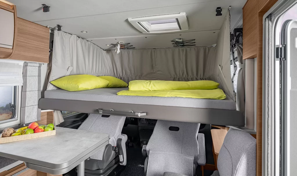 Suggestiva illuminazione d’ambiente Ampi letti singoli nella zona posteriore Letto basculante di serie nella zona anteriore Frigorifero XL con 142 litri di capacità Bagno a volume variabile con parete doccia girevole Fantastica sensazione di spazio e benessere