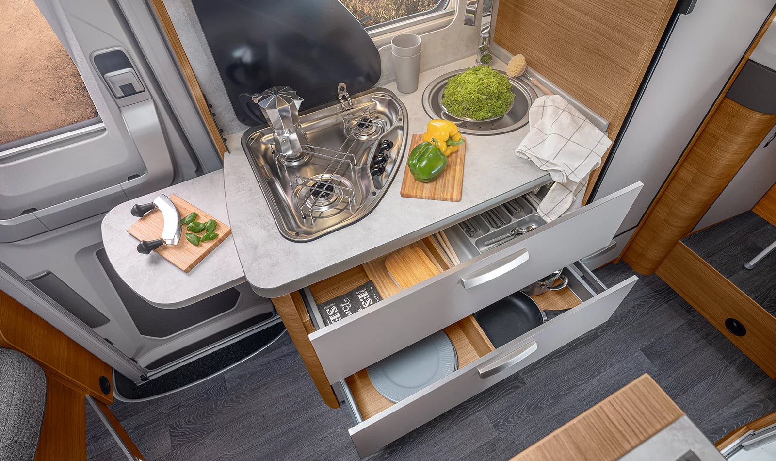 Avere il proprio bagno in viaggio è un’autentica comodità. Poterlo portare ovunque è un vero lusso. Soprattutto quando è allestito in modo ottimale come qui con il mobiletto extra large.