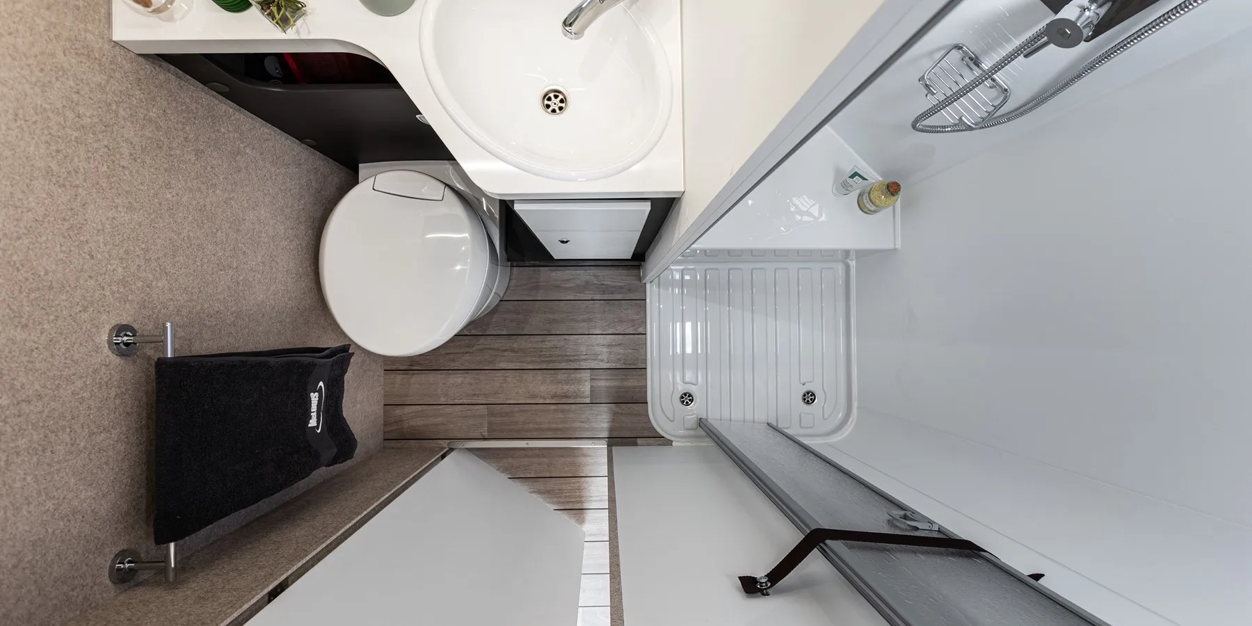 – Spessore del pavimento: 54 mm – Spessore del soffitto e delle pareti: 30 mm – Tetto esterno in vetroresina – Pareti interne/esterne in vetroresina – Area inferiore del telaio rivestito in vetroresina”