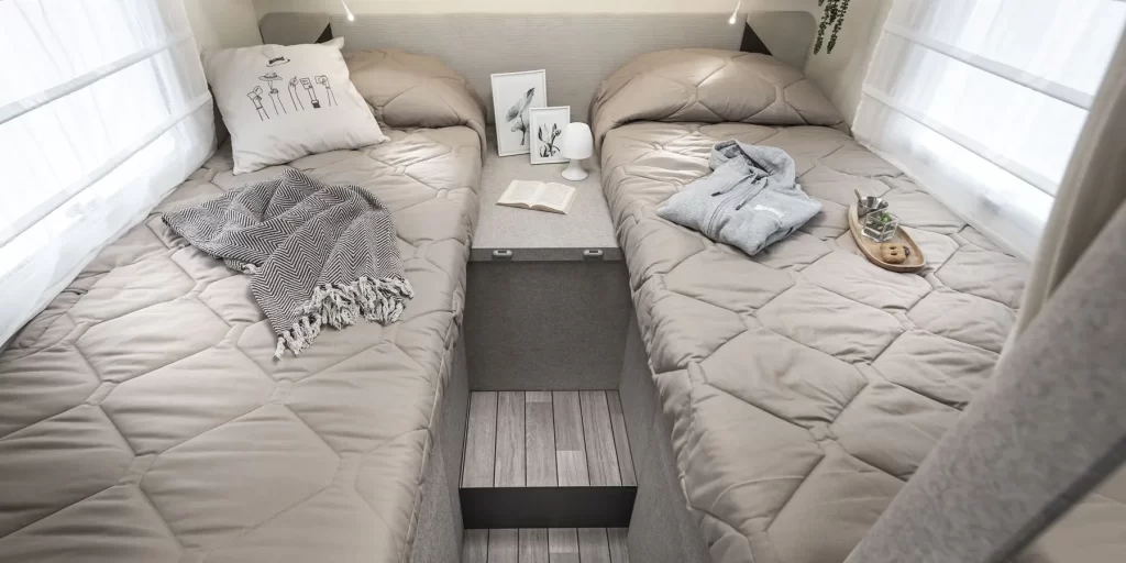 MC4 339 profilato con letto basculante sotto i 7 metri con letti gemelli, con uno dei 2 letti di ben 2 metri di lunghezza.
