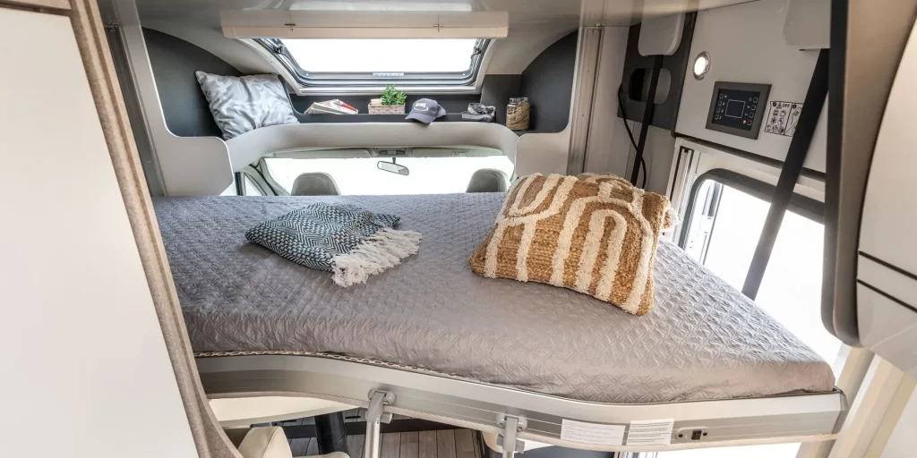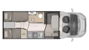 MC4 365 profilato con letto basculante sotto i 7 metri con letti gemelli, con uno dei 2 letti di ben 2 metri.