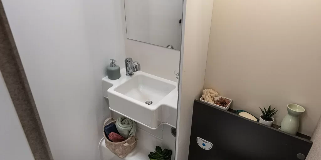 – Spessore del pavimento: 54 mm – Spessore del soffitto e delle pareti: 30 mm – Tetto esterno in vetroresina – Pareti interne/esterne in vetroresina – Area inferiore del telaio rivestito in vetroresina”