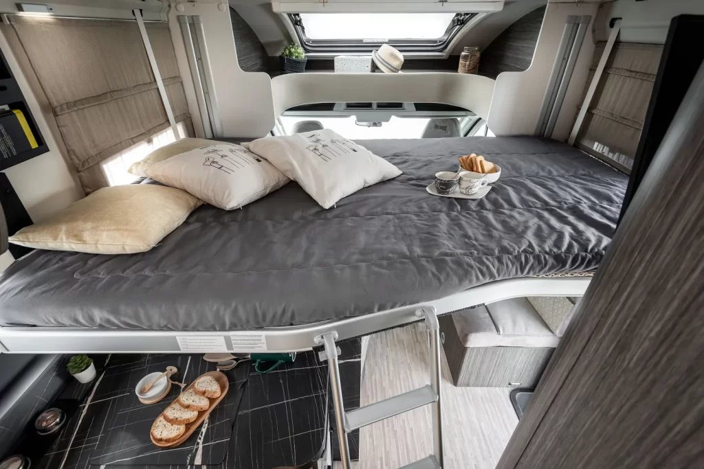 · Profilato con letto basculante di 7,45 metri di lunghezza · Letti gemelli · Toilette con doccia