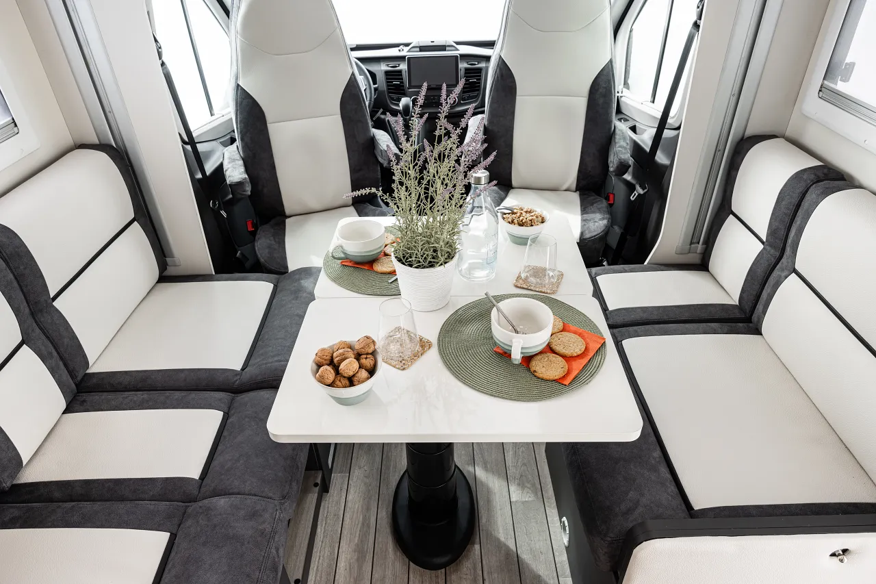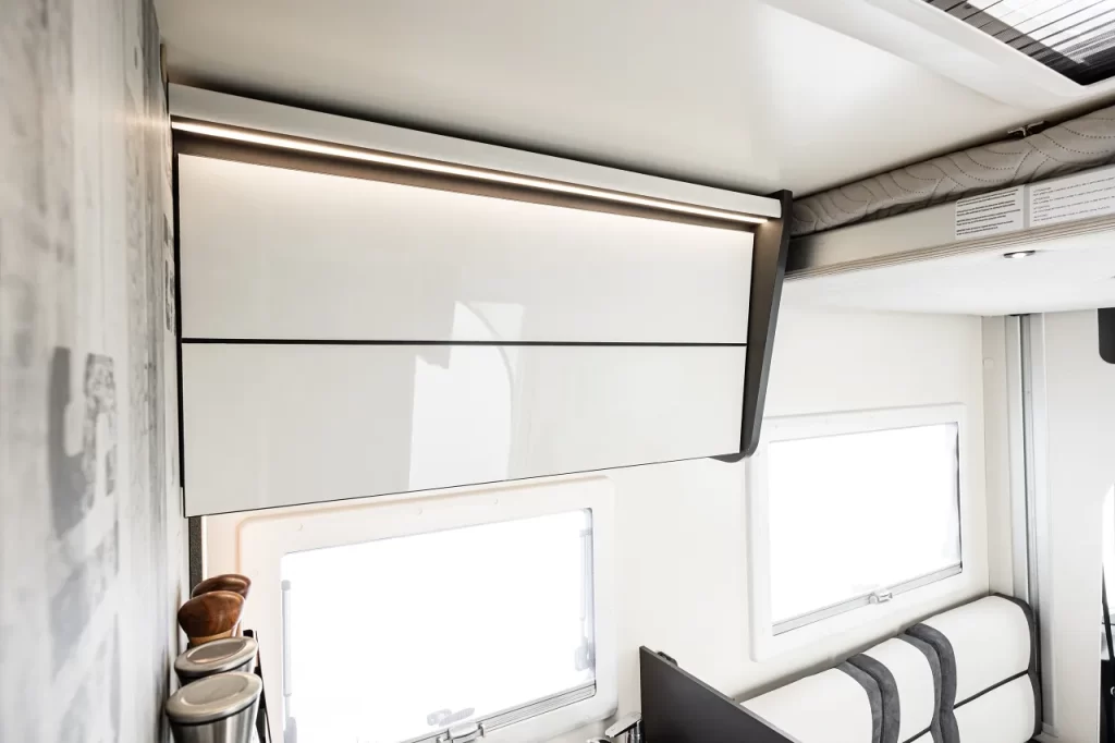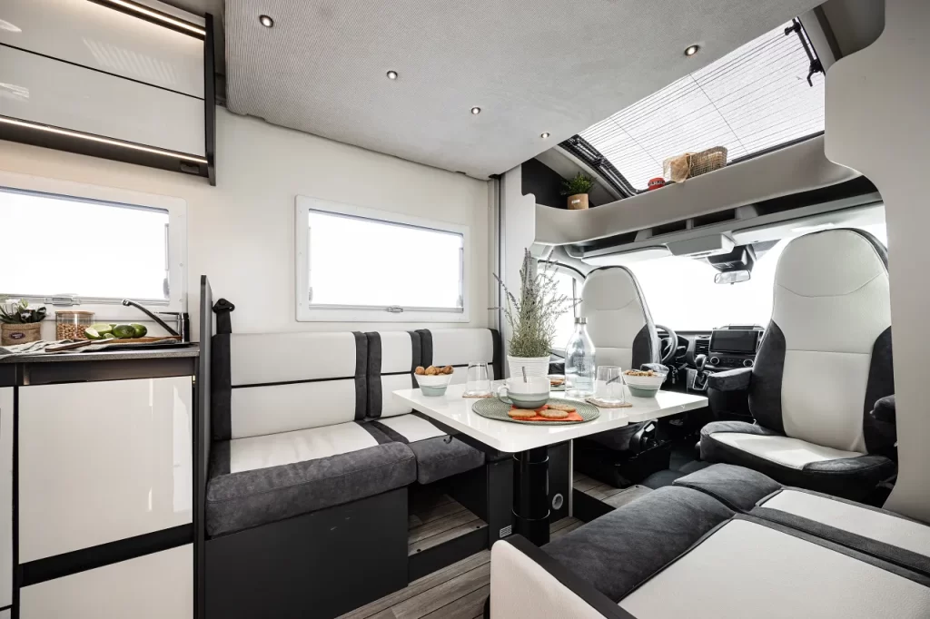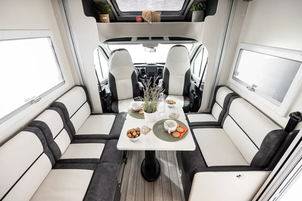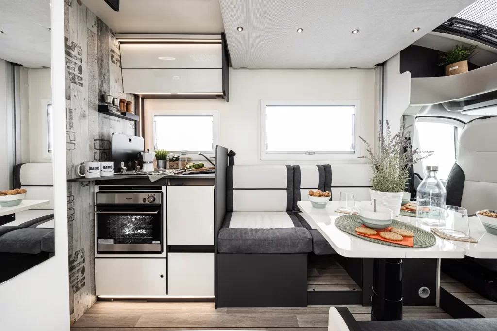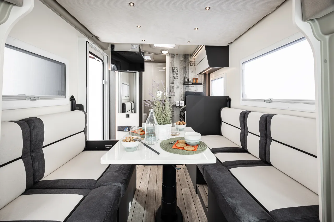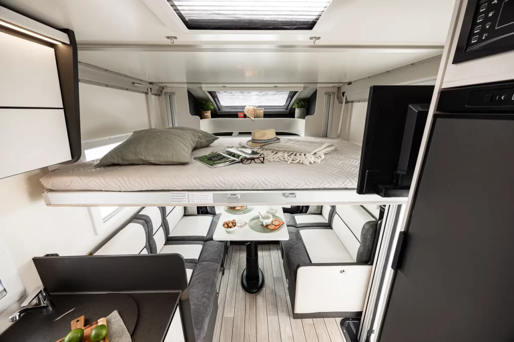 Profilato compatto con letto basculante 190 cm · Sotto i 6,5 metri di lunghezza · Maxi salone