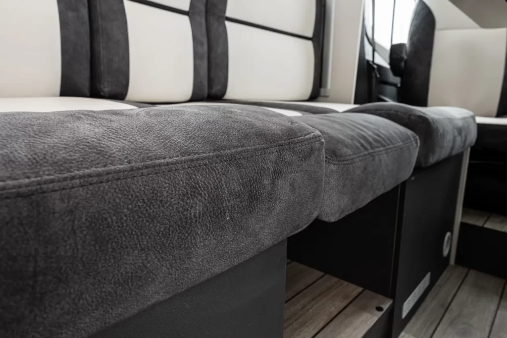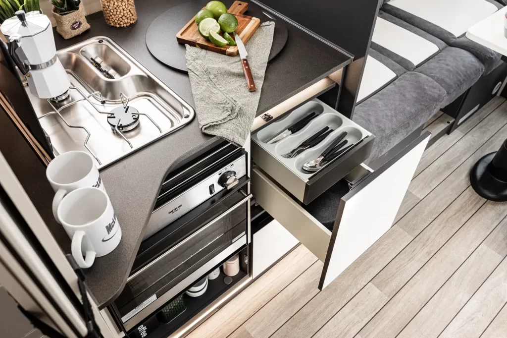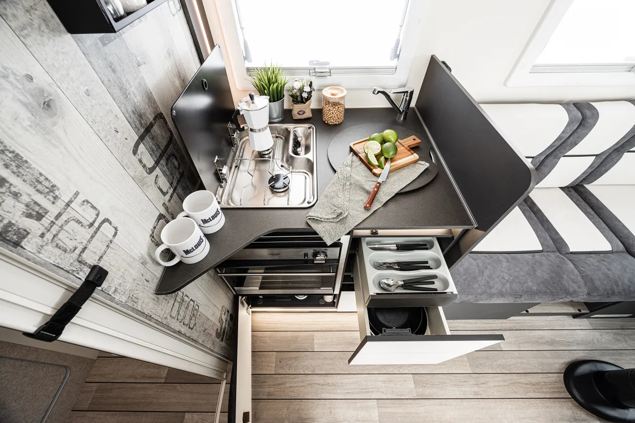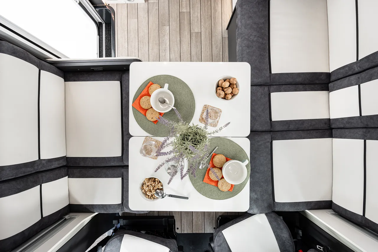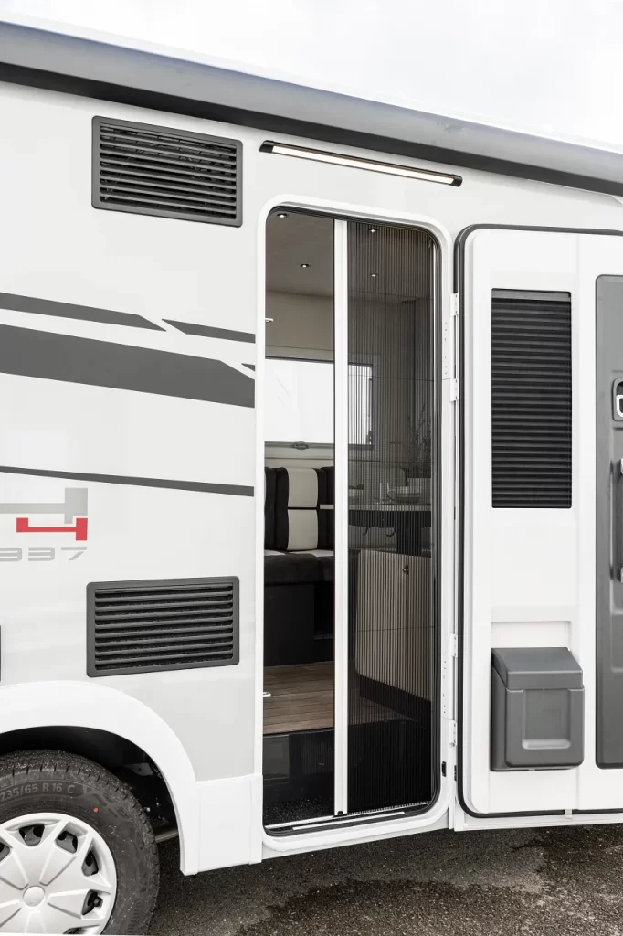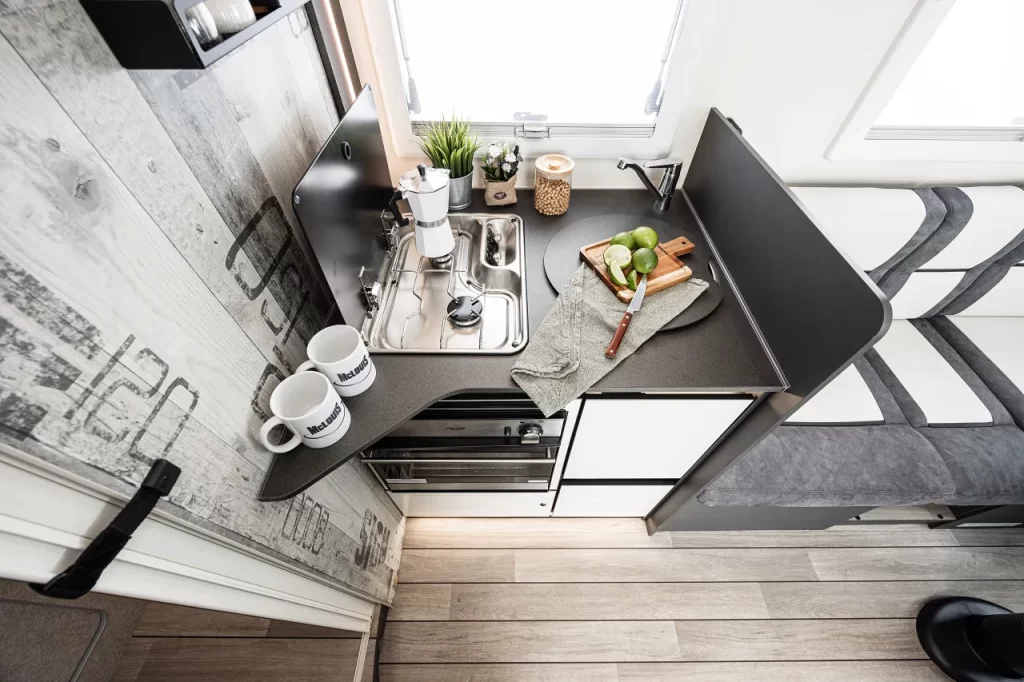 Profilato compatto con letto basculante 190 cm · Sotto i 6,5 metri di lunghezza · Maxi salone