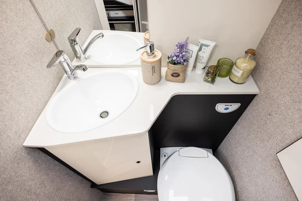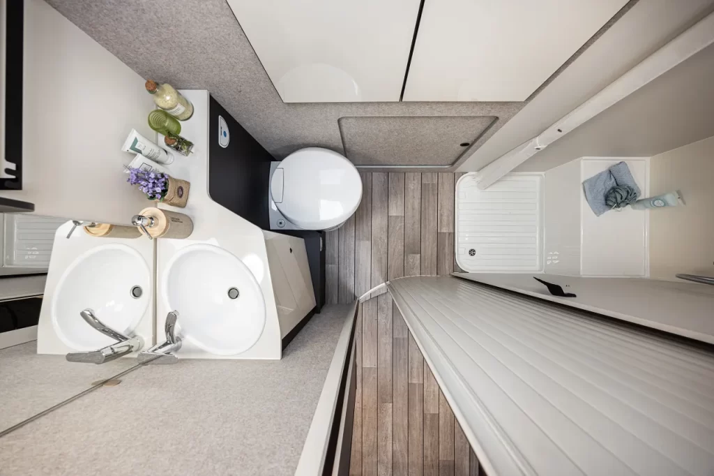– Spessore del pavimento: 54 mm – Spessore del soffitto e delle pareti: 30 mm – Tetto esterno in vetroresina – Pareti interne/esterne in vetroresina – Area inferiore del telaio rivestito in vetroresina”