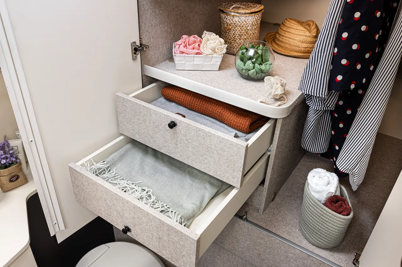 con tavolo a libro · Ampia toilette posteriore · Grande armadio posteriore