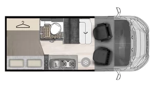 Menfys 1 base il più compatto della gamma, lungo come una monovolume. Con letto matrimoniale posteriore.