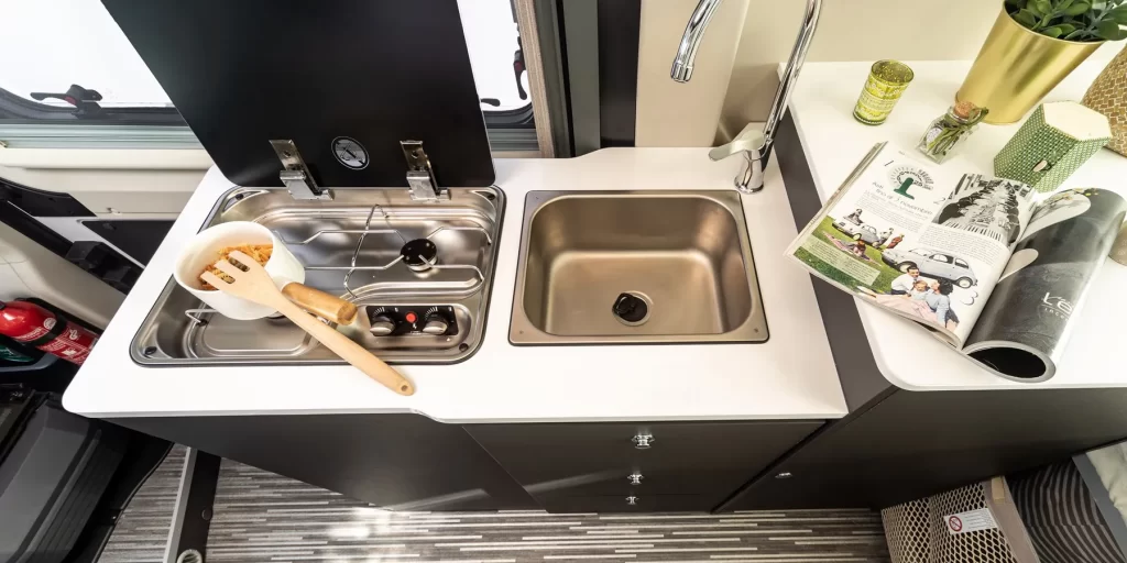 Lavello in acciaio, miscelatore come a casa, ottimo stivaggio