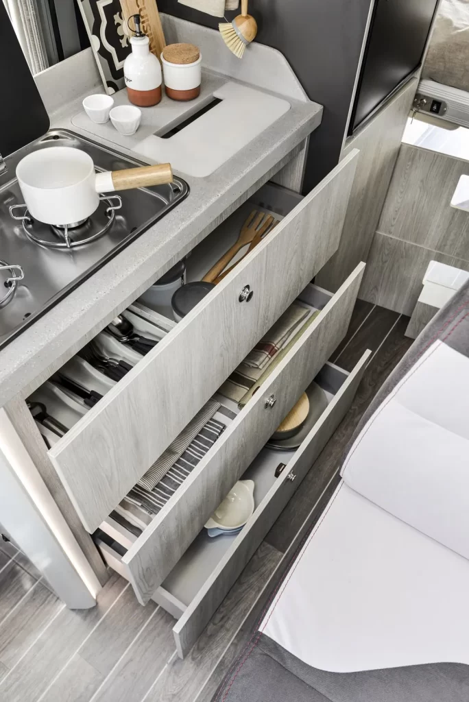 Cestoni scorrevoli e ampi cassetti sotto il