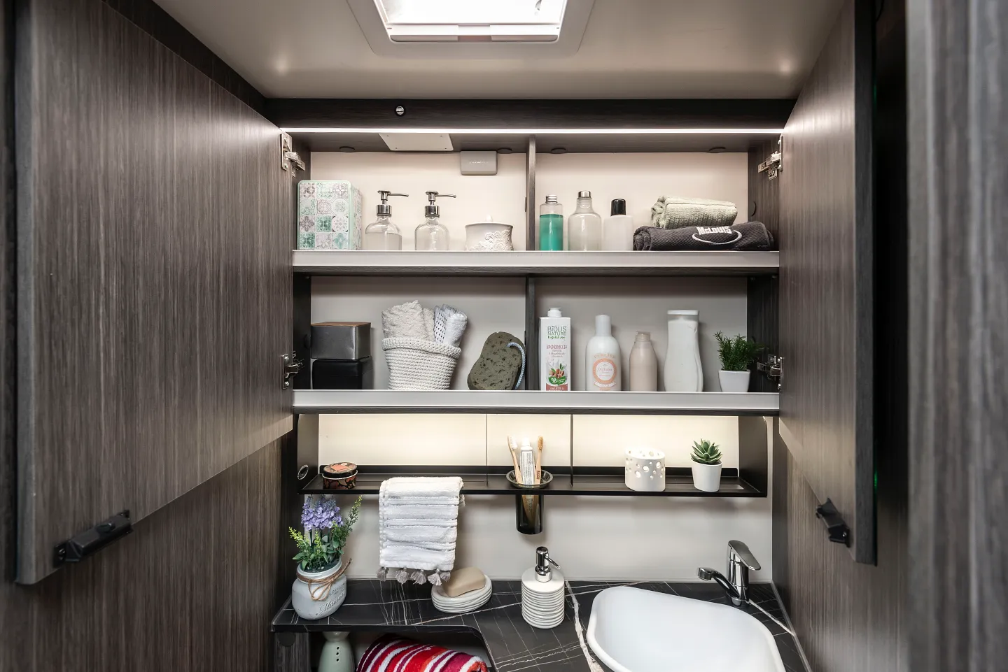 Supporto per oggetti visibili lungo tutta la lunghezza del bagno