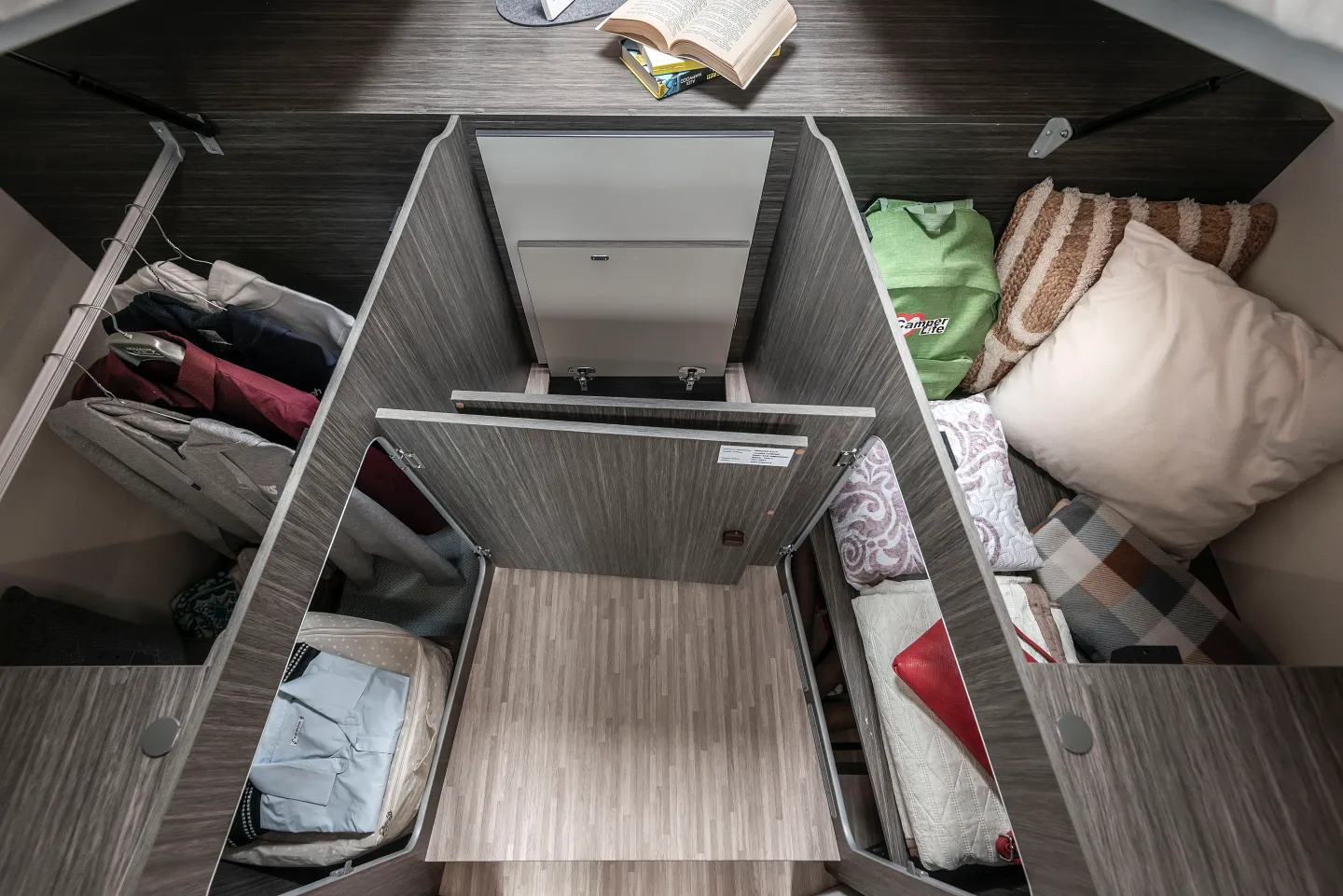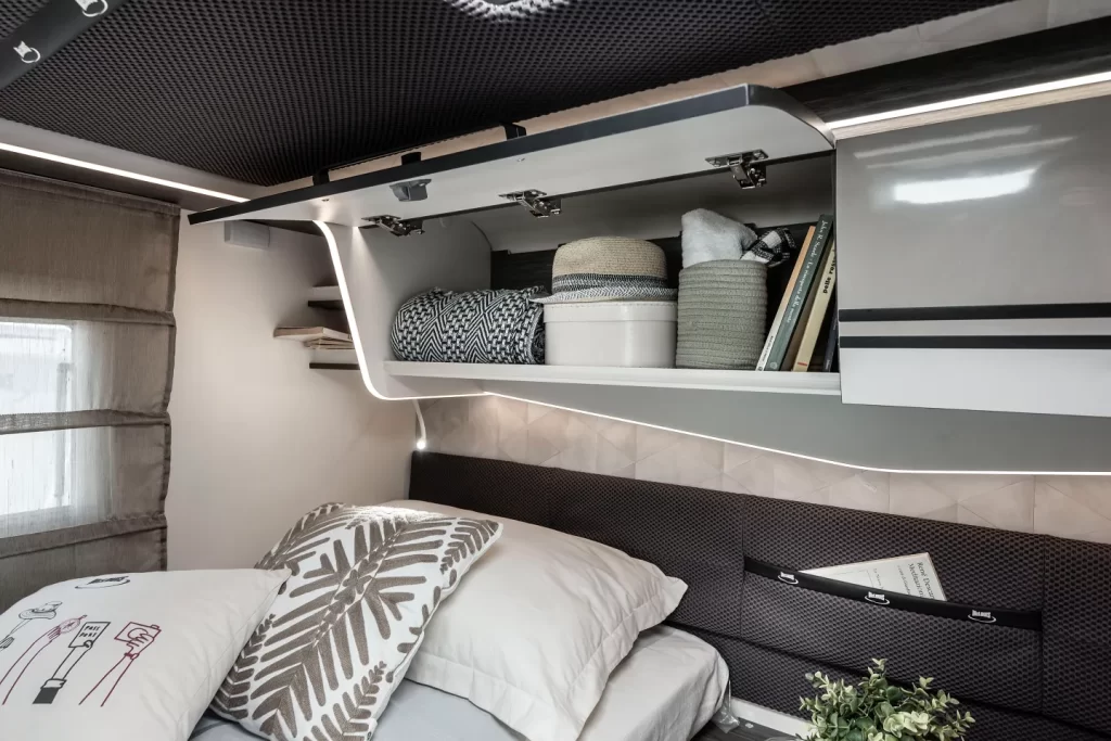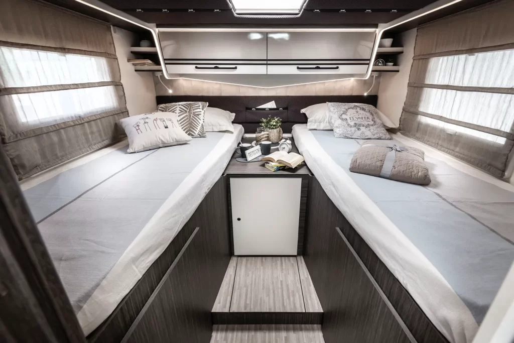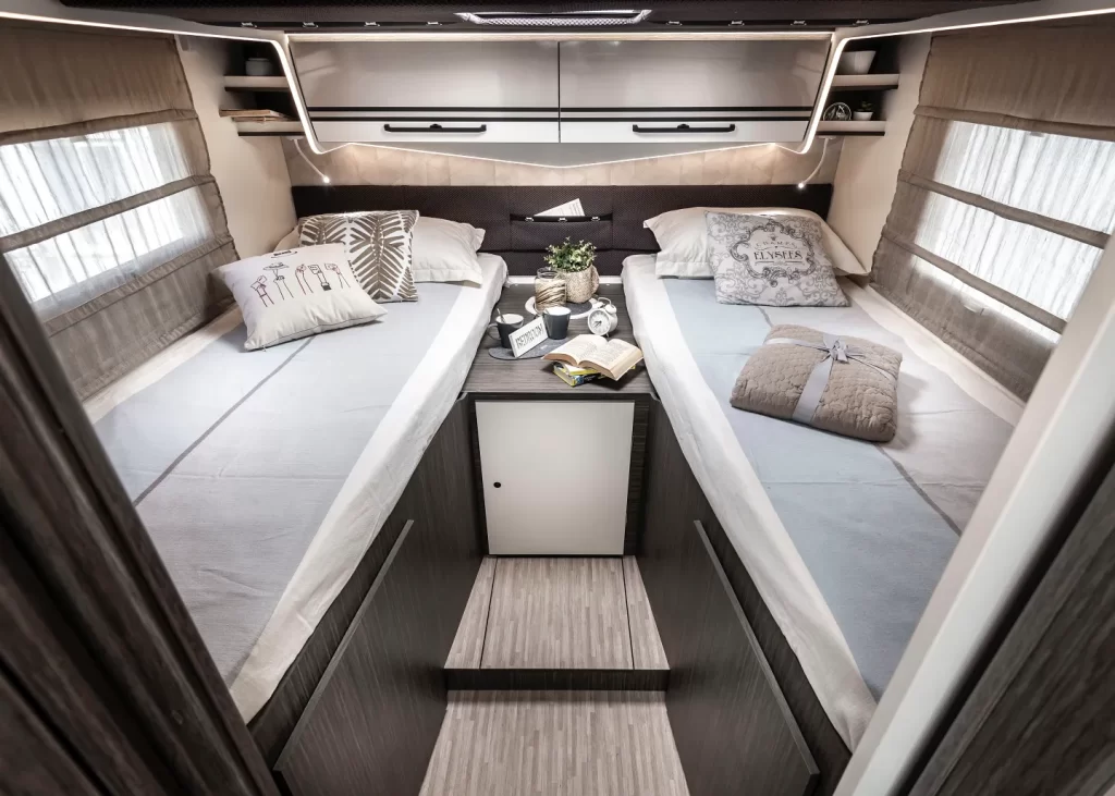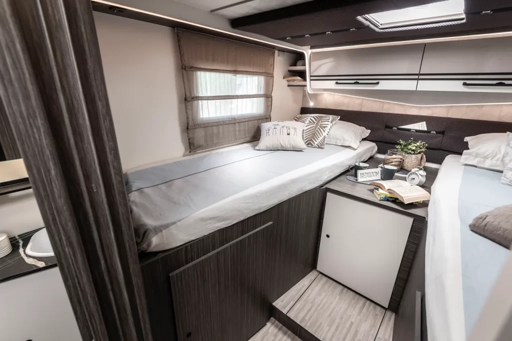 Integrale 7,45 metri di lunghezza · Letti gemelli trasformabili in maxi matrimoniale