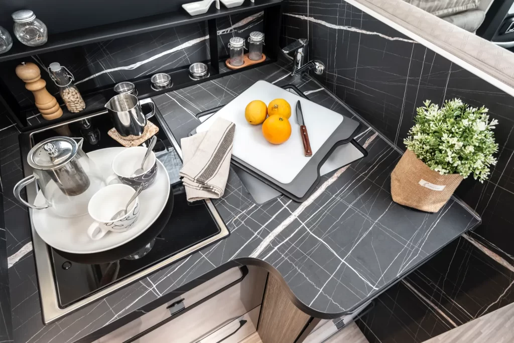 – Spessore del pavimento: 54 mm – Spessore del soffitto e delle pareti: 30 mm – Tetto esterno in vetroresina – Pareti interne/esterne in vetroresina – Area inferiore del telaio rivestito in vetroresina”