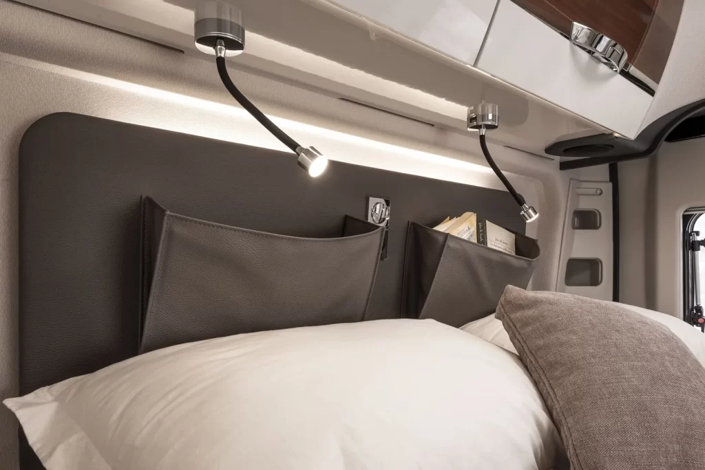 Sedili sagomati con poggia testa regolabili. Pensili con illuminazione interna automatica all’apertura.