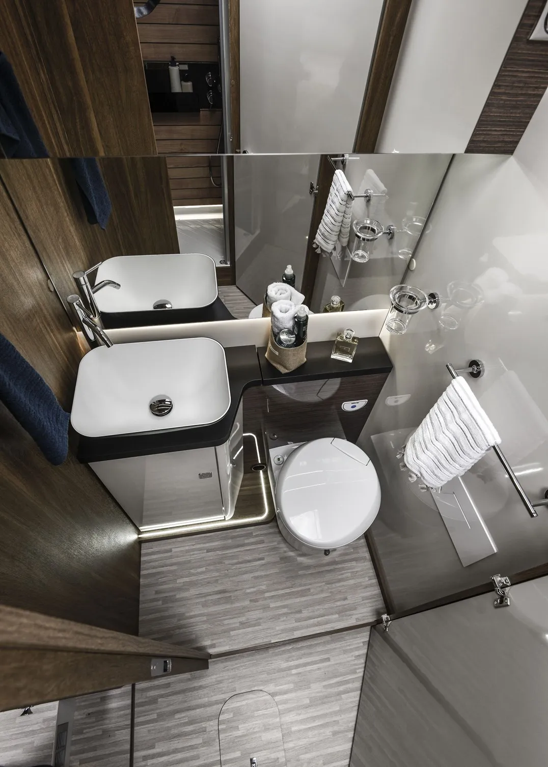 Toilette e doccia separati: utilizzabili contemporaneamente. Igiene: piano in laminato opaco antibatterico.