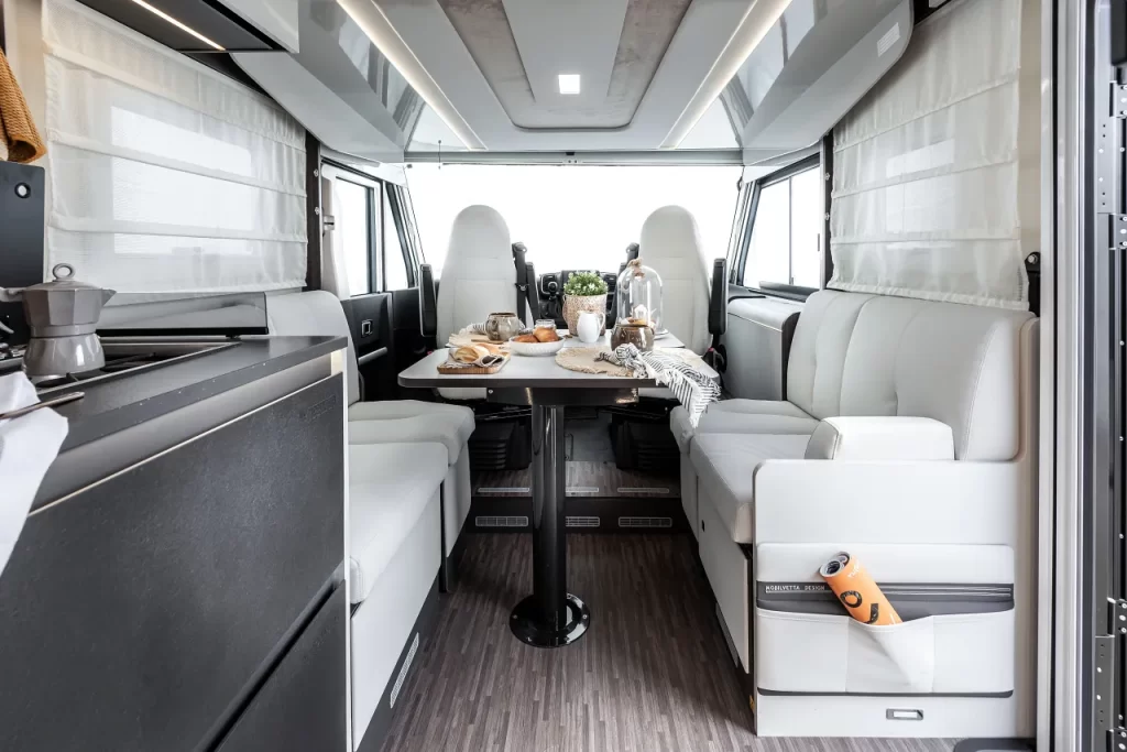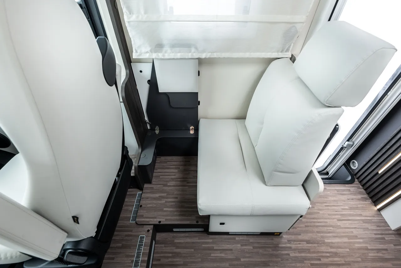 I sedili cabina, si ruotano per integrarsi in un salotto. Ampliata la seduta del divano laterale.