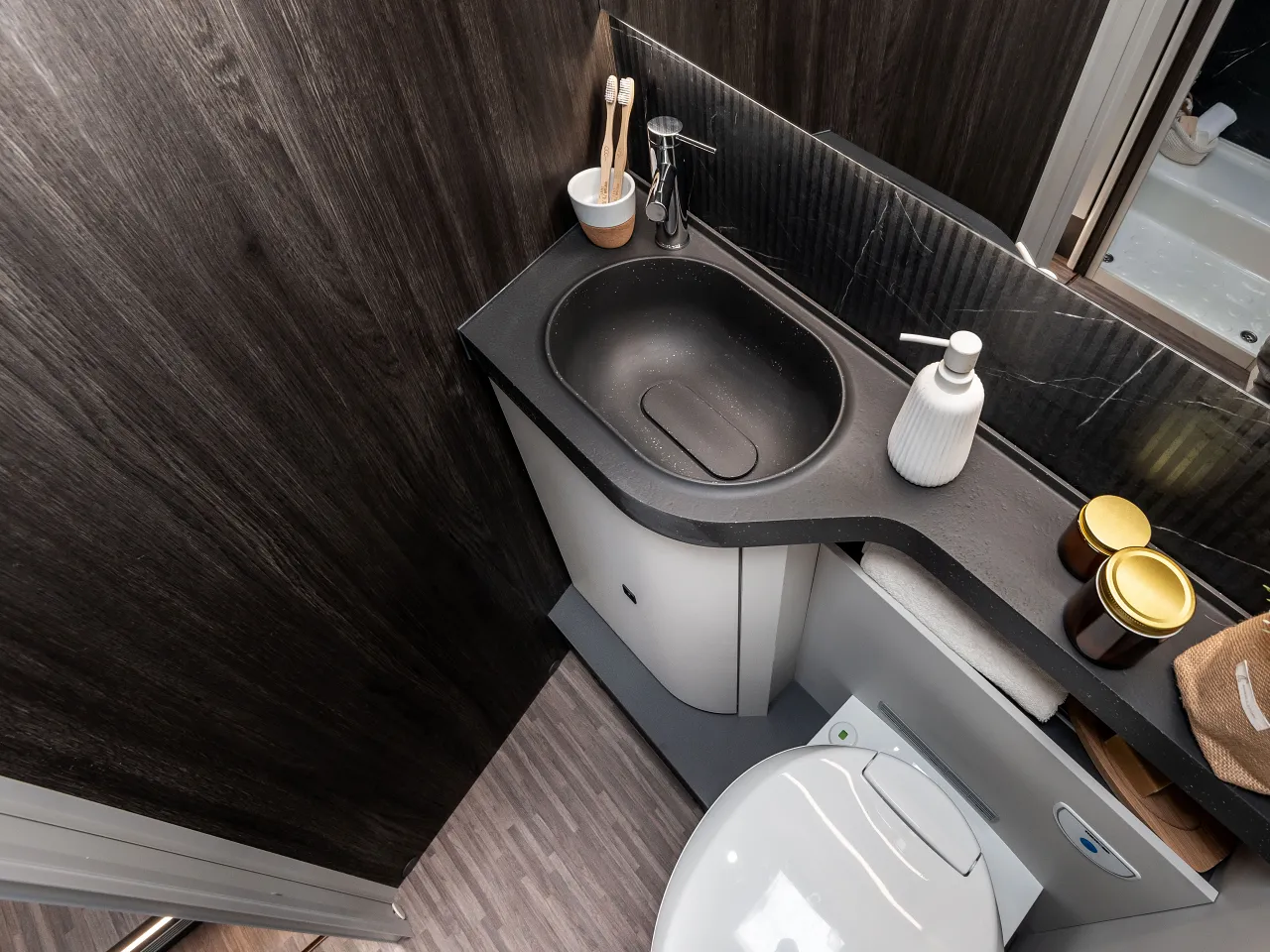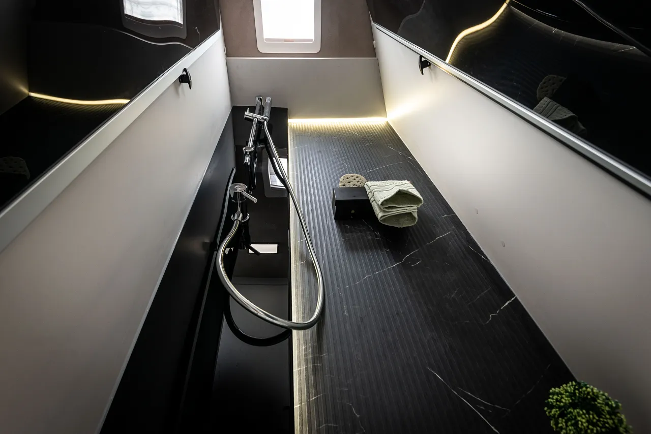 Toilette e doccia separati: utilizzabili contemporaneamente. Igiene: piano in laminato opaco antibatterico.