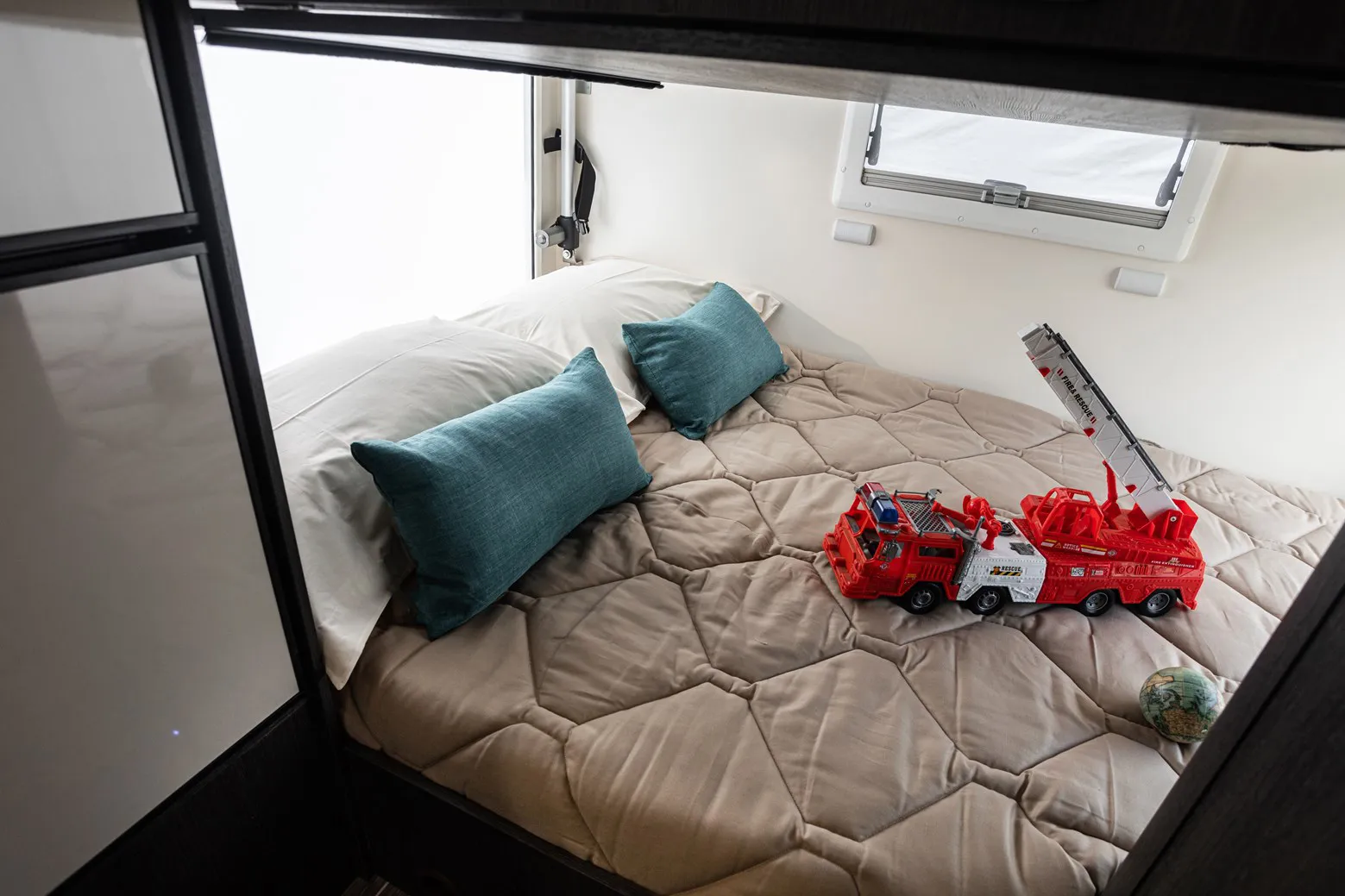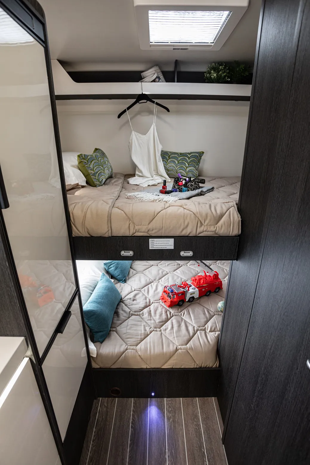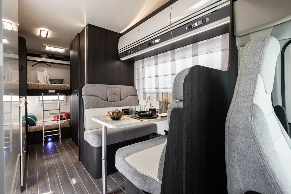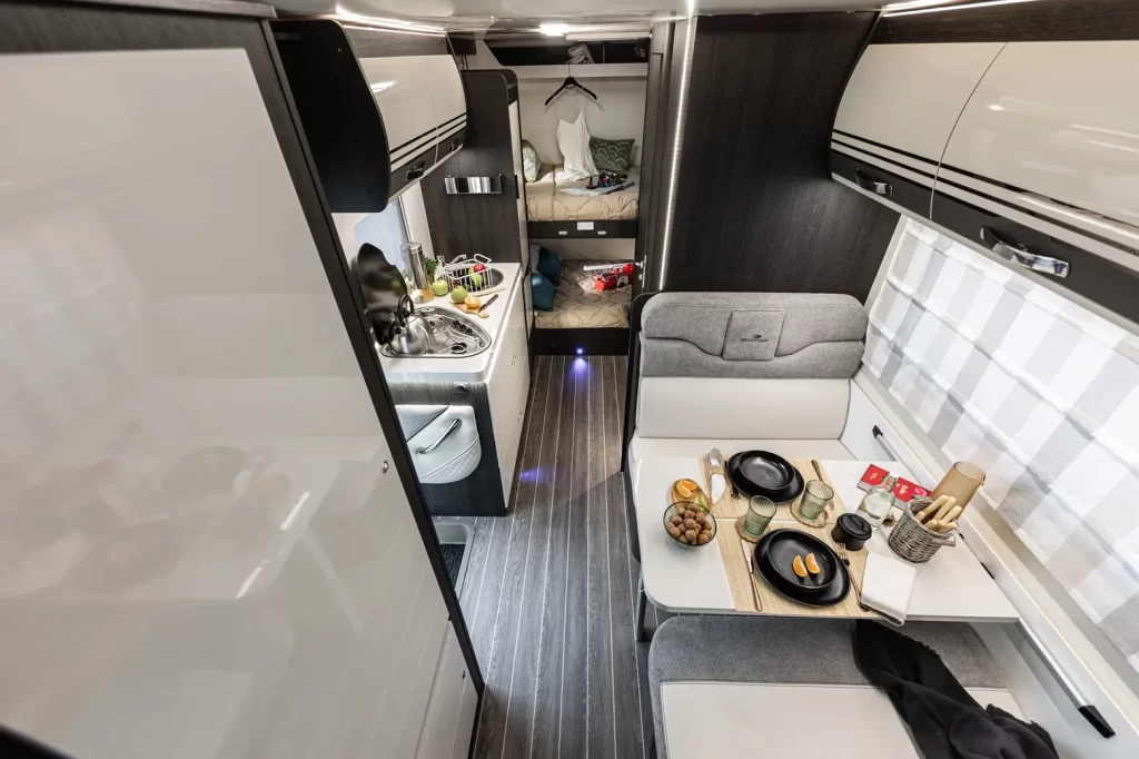 Trasformazione della dinette in un letto matrimoniale longitudinale.