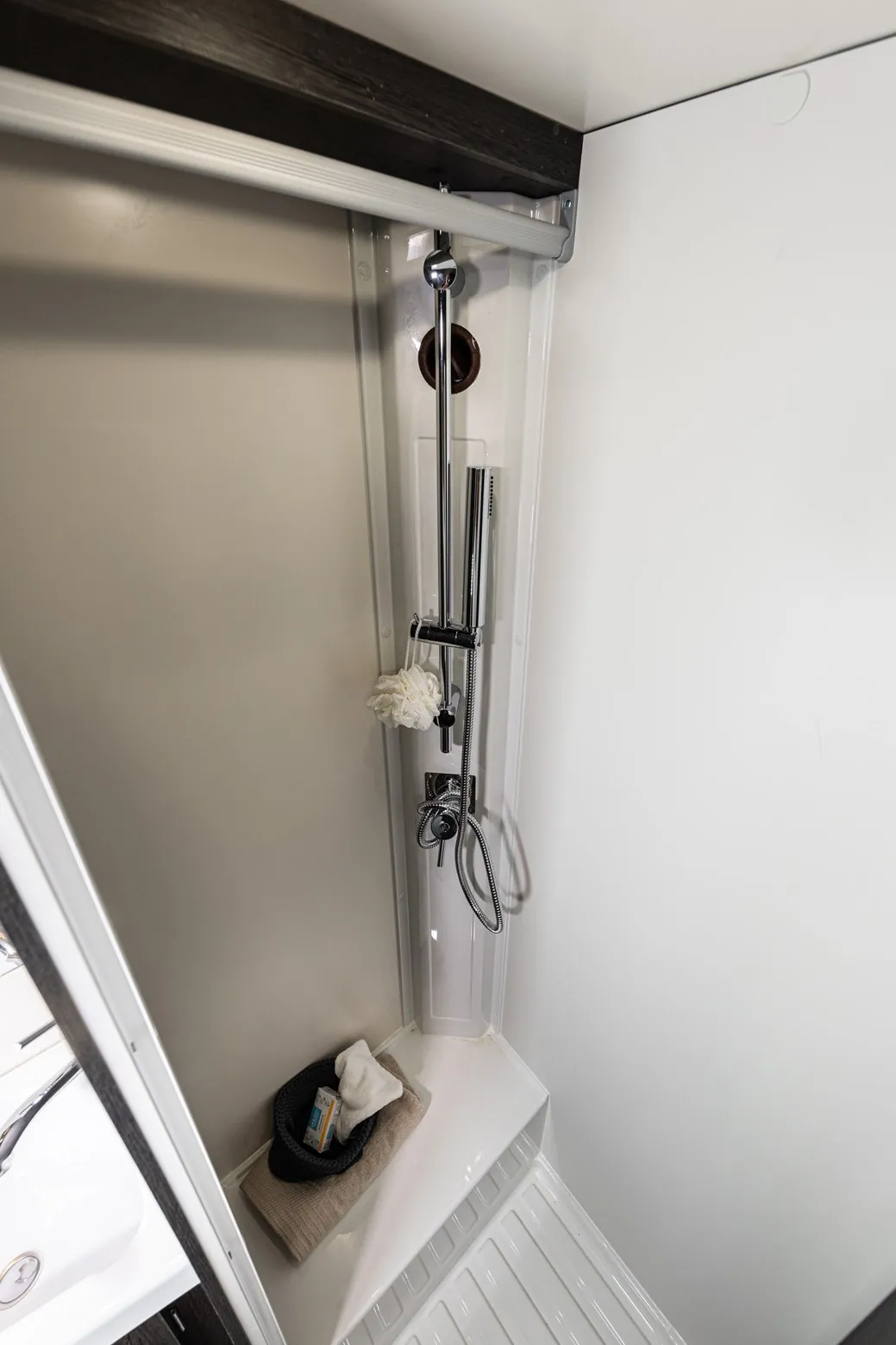 – Spessore del pavimento: 54 mm – Spessore del soffitto e delle pareti: 30 mm – Tetto esterno in vetroresina – Pareti interne/esterne in vetroresina – Area inferiore del telaio rivestito in vetroresina”